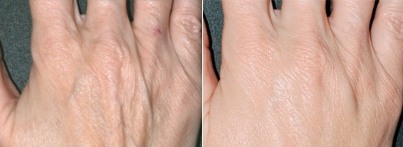- Po trzecie – w pewnym wieku dużym problemem stają się ubytki tkanki łącznej, które powodują na grzbietach rąk powstawanie zagłębień pomiędzy ścięgnami. Ścięgna oraz żyły stają się coraz bardziej widoczne. Aby temu zapobiec stosuje się powszechnie wypełniacze tkankowe – najczęściej hydroksyapatyt wapnia (np. Radiesse) oraz kwas hialuronowy.